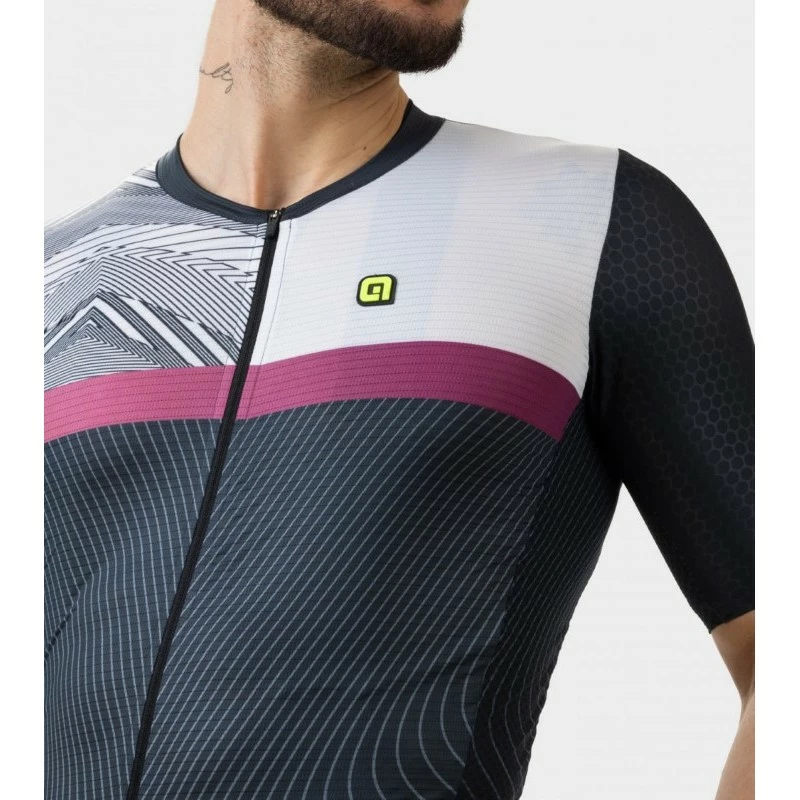 Zig Zag è Il top di gamma Alé, sviluppata in collaborazione con i pro- team per raggiungere il massimo livello di aerodinamicità e studiata sulla postura tipica dell’atleta durante la competizione. Grazie alla tecnologia Body Mapping, ogni tessuto è strategicamente posizionato seguendo l’anatomia del corpo, adattandosi come una seconda pelle. Il connubio tra le qualità antistatiche del tessuto Rap Dry Carbon con filo di carbonio, e la leggerezza del Micro Aero capace di garantire ricircolo d’aria e rapida asciugatura, si unisce alla traspirabilità della rete Piuma sul sottomanica, assicurando così un comfort senza eguali e solo 115 grammi di peso. Il fondo maglia anteriore con la costruzione sagomata J Stability System è studiato per mantenere efficacemente il capo a posto durante la corsa permettendo una vestibilità impeccabile. La manica a giro, perfettamente aderente al corpo, termina con l’aerodinamico e stabile inserto sagomato S-Stability System, a taglio vivo e con leggeri punti di silicone. Il fondo posteriore è realizzato con un elastico siliconato che aumenta l’aderenza e la stabilità della maglia rispetto al pantaloncino sottostante. Non può mancare l’attenzione alla sicurezza, con dettagli riflettenti nella parte posteriore.